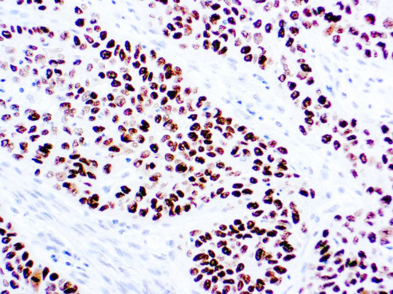 p40 is a relatively unknown antibody that recognizes ΔNp63-a p63 isoform suggested to be highly specific for squamous/basal cells. In a recent study, p40 is equivalent to p63 in sensitivity for squamous cell carcinoma, but it is markedly superior to p63 in specificity1, which eliminates a potential pitfall of misinterpreting a p63-positive adenocarcinoma or unsuspected lymphoma as squamous cell carcinoma. These findings strongly support the routine use of p40 in place of p63 for the diagnosis of pulmonary squamous cell carcinoma.