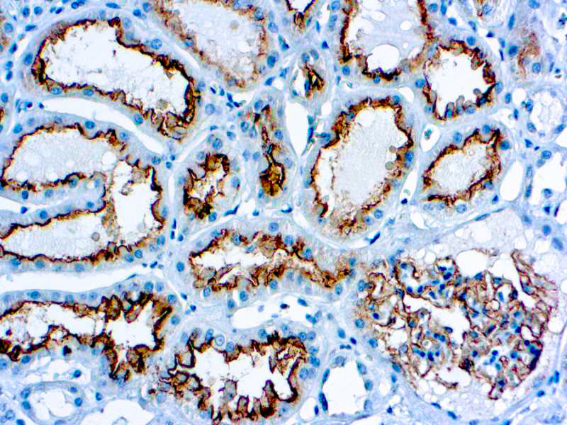 The common acute lymphoblastic leukemia antigen (CALLA/CD10) is a single-pass type II transmembrane metallo-endopeptidase that cleaves and inactivates a variety of peptide growth factors important for signal transduction including the enkephalins, bombesin and substance P. CD10 is expressed by a number of hematopoietic cells such as immature T and B cells, B cells of the germinal centers of lymphoid follicles and granulocytes. It also reacts with a variety of non-hematopoietic cells, including epithelial cells in GI tract and kidney tubular. In liver, the bile canaliculi shows a moderate to strong staining. CD10 has been used for the identification and classification of certain types of malignant lymphoma and leukemia. CD10 is expressed in a high percentage of cases of acute lymphoblastic leukemia, follicular lymphoma, Burkitt's lymphoma, some hematopoietic tumors, and chronic myelogenous leukemias in lymphoid blast crisis. It is also known to be a marker of endometrial stromal cells. It is helpful in differentiating endometrial stromal sarcoma (ESS) from uterine cellular leiomyoma (UCL) and uterine leiomyosarcoma (ULS).